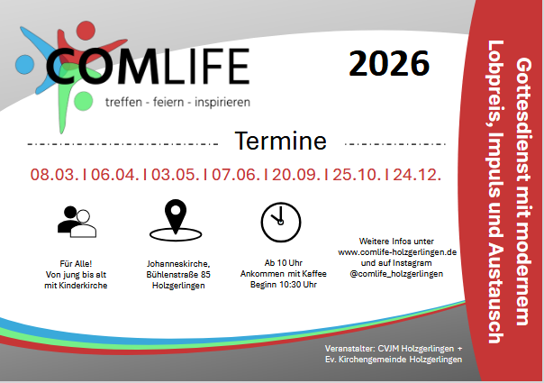 COMLIFE ist ein Gottesdienst, der Menschen aller Altersgruppen zusammenbringt, um Gott anzubeten und mehr über ihn zu erfahren. Es ist eine Zusammenarbeit zwischen dem CVJM Holzgerlingen und der evangelischen Kirchengemeinde Holzgerlingen.